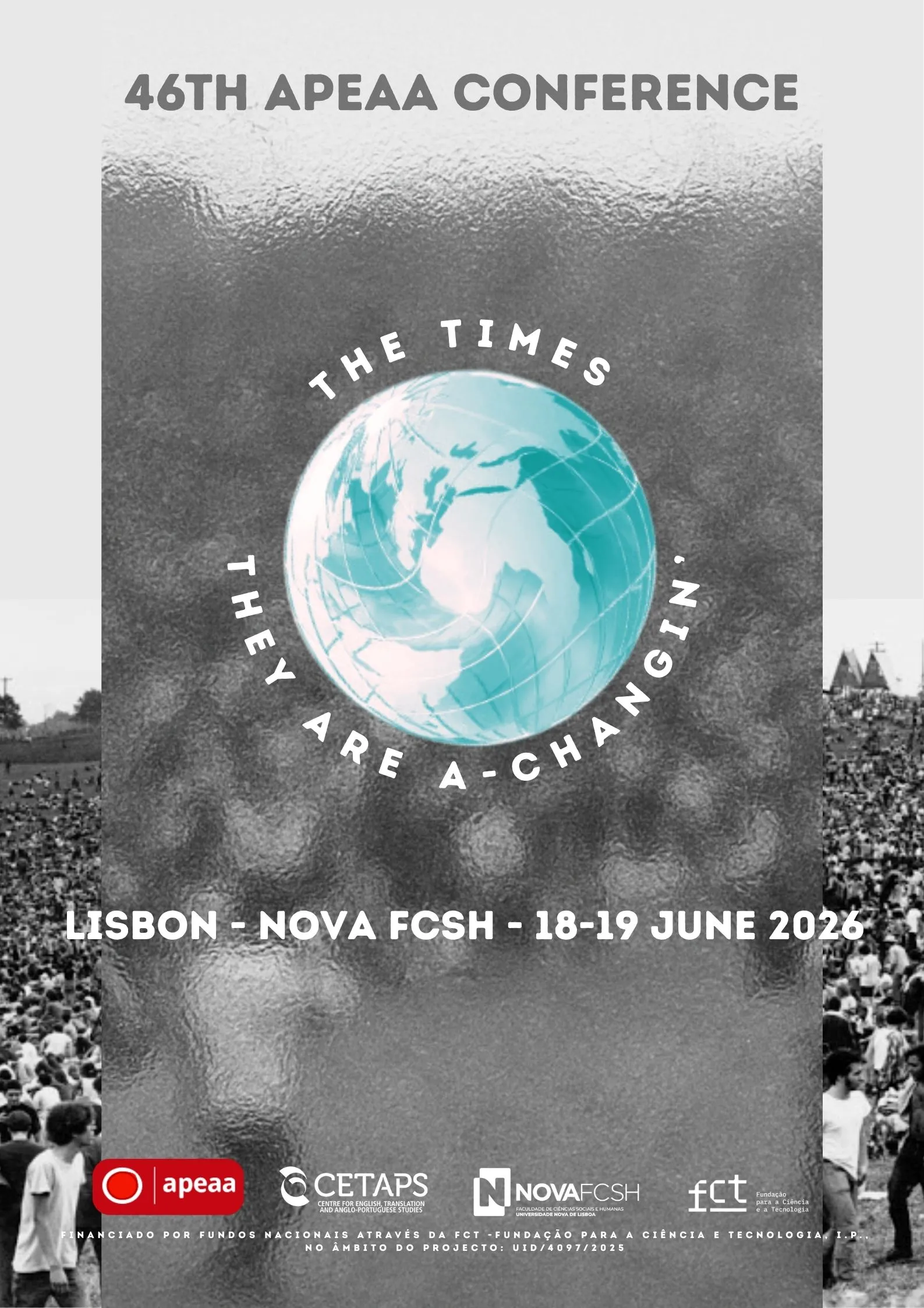 46th APEAA Conference: The Times They Are A-Changin', NOVA University of Lisbon – School of Social Sciences and Humanities (NOVA FCSH), June 18-19, 2026 Abstracts of 250–300 words Please include a short biographical note (50–100 words) Individual papers, panels, and roundtable proposals are welcome Abstracts should be sent to: imom@fcsh.unl.pt and mzc@fcsh.unl.pt Important Dates Abstract submission deadline: April 15, 2026 Notification of acceptance: April 30, 2026 Conference dates: June 18-19, 2026 For more information, check the conference website: https://apeaa2026.wo